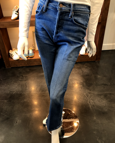 TGIF. A high-rise flare with a button fly and a clean ankle-length hem. Made from stretch denim, Work Hard Play Hard is a mid-blue wash with subtle whiskering and fading at the knees.