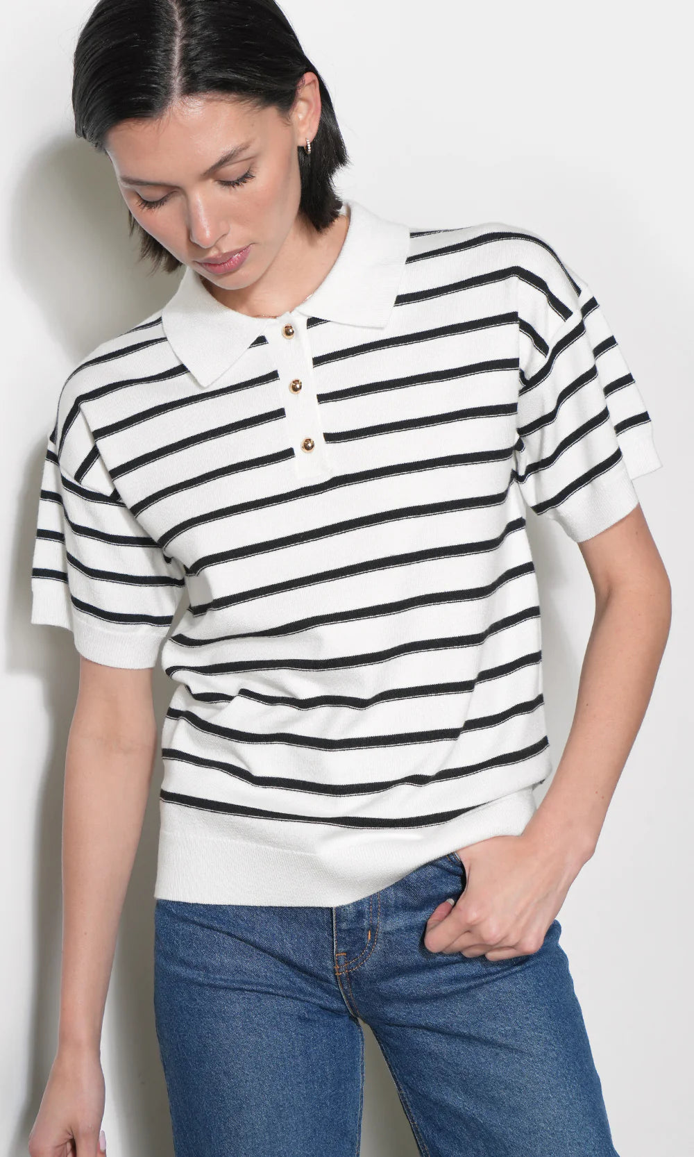 Featuring a classic, high-contrast White and Black stripe pattern, this top is crafted from a soft knit material, ensuring a beautiful, comfortable drape. The silhouette is defined by the polo neckline—a notched or button-up collar—which gives it a smart, sporty feel.