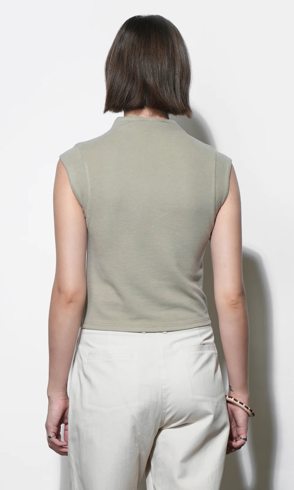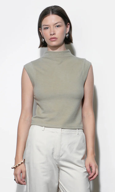 Featured in a rich Olive color, this top is crafted from a comfortable knit material, offering structure and warmth. The defining feature is the funnel neck, which stands up slightly to frame the face and provide a modern, polished look without the bulk of a full turtleneck.