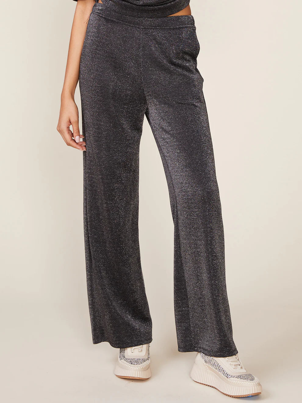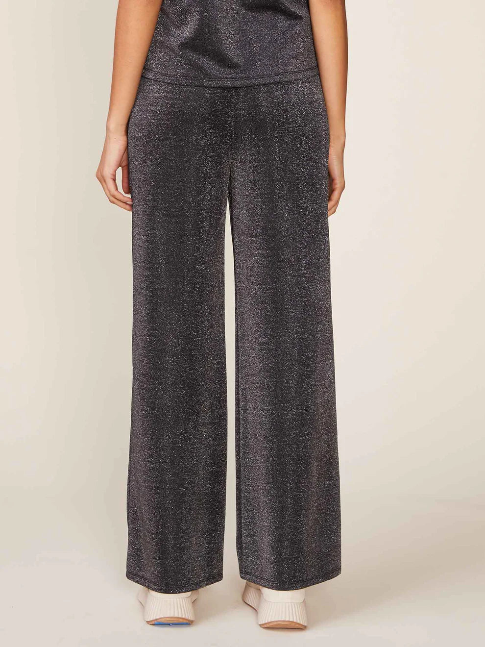 These stretch metallic knit full-length pants are festive and fun. Details include on seam pockets, a flat front and elasticized back. Pair with the Glitter Knit Oversized Tee for a comfy, shimmery set.