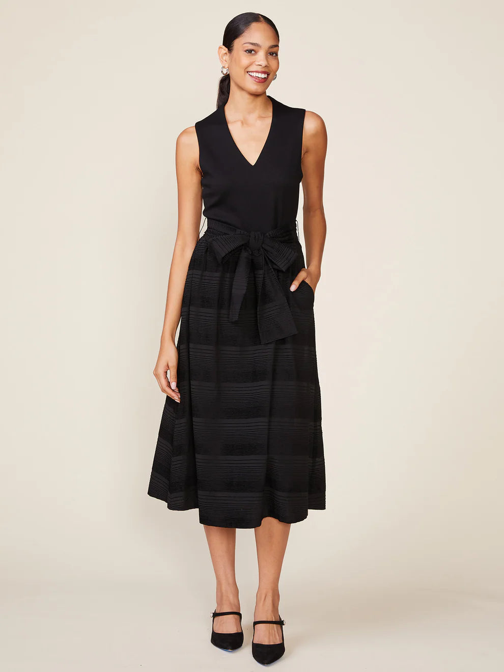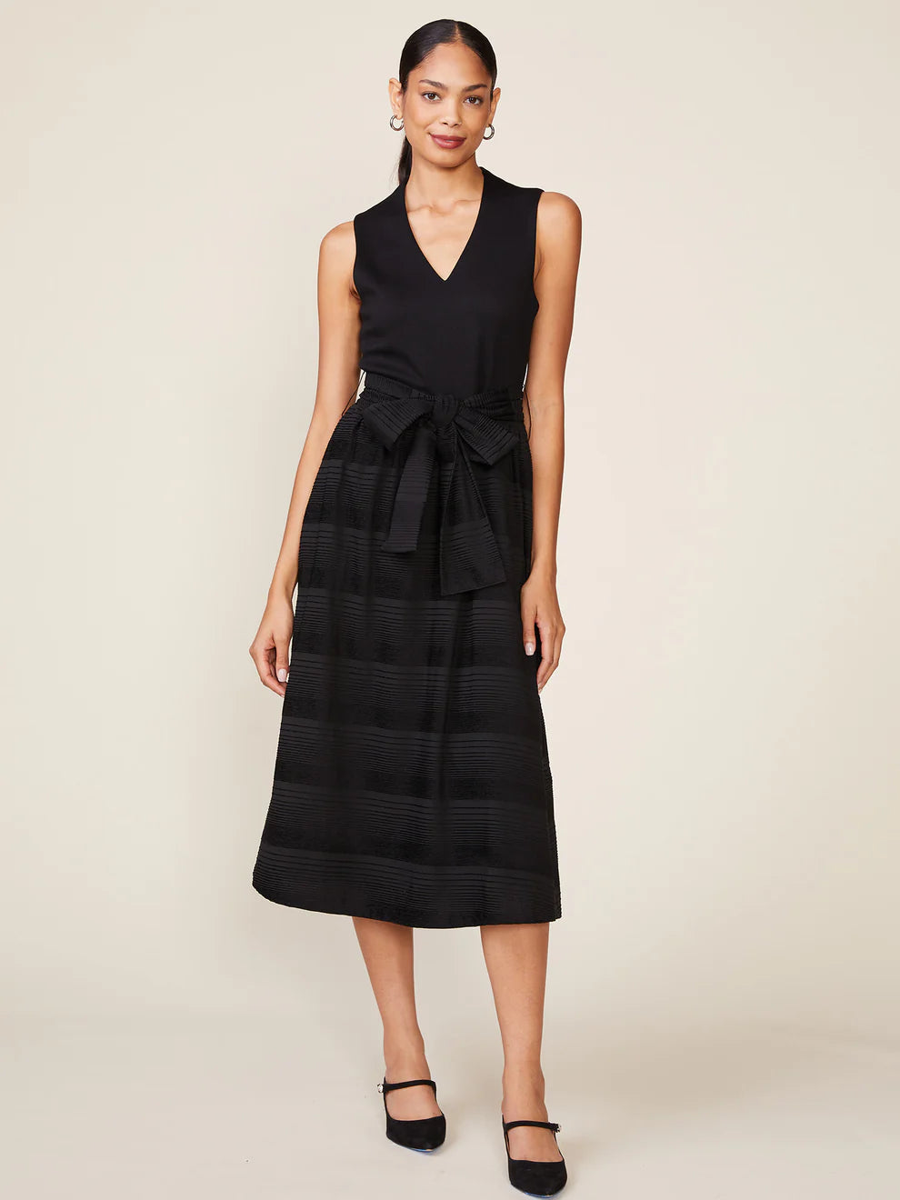 This knit to woven midi dress is perfect for the holiday season. The sleek knit bodice is form fitting, yet plush with a flattering v neckline. The midi skirt is made of a sheer woven fabric with flocked velvet stripes. The sash can be tied in the back for a femme bow back detail or in the front for a different look. matter the occasion you will be photo ready in this stunning, textured, black dress.