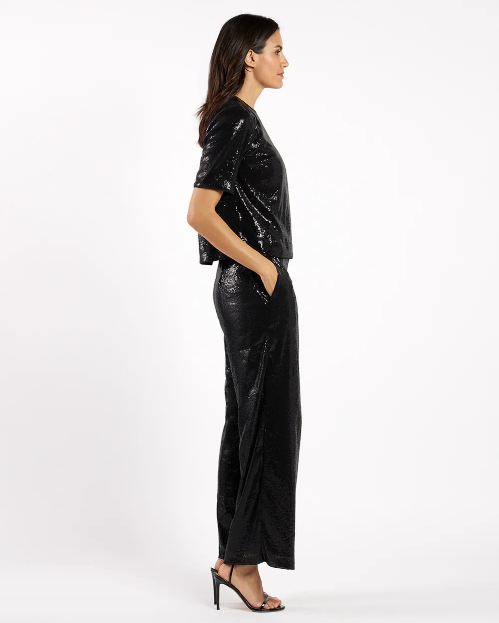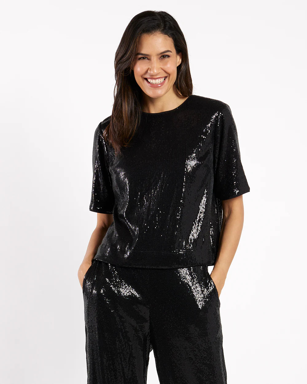 Introducing Maude! A classic t-shirt silhouette designed with a timeless crew neckline, short sleeves, and a keyhole clasp in the back. This top is elegant and dazzling, making it the perfect choice for your most special occasions. Pair it with our Nicolette Sequin Pant for a striking head-to-toe statement look.