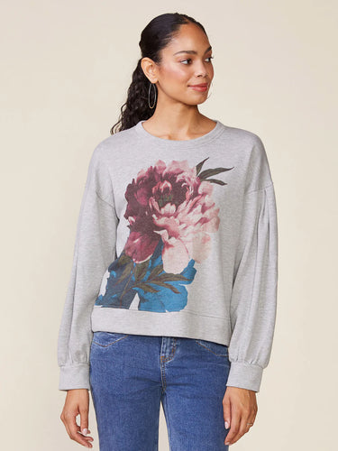 This is a classic crewneck pullover featuring dropped shoulders and pleated sleeve details with a bold, oversized statement flower print. Soft, comfortable and equally eye-catching, this pullover easily elevates any casual fit.