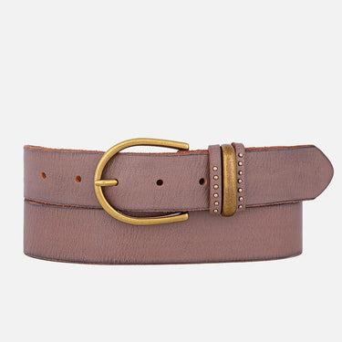 A classic belt for women is our favorite thing to do & neutral colors are a favorite when layering pieces. Unique buckles & keepers are what set our classic leather belts apart from the rest. As much as we love to brag about the quality & durability of our premium leather belts, we cannot ignore the fine Italian hardware accents that bring elegance into our timeless pieces. The Norine is a unique design with subtle studs and gold keeper coupled with a sleek rounded antique gold buckle.