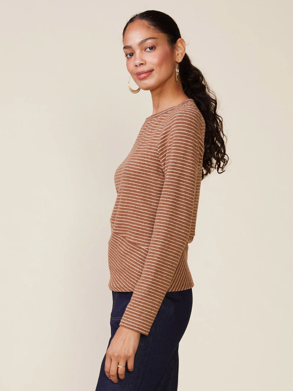 This brushed stripe knit in beautiful shades of copper and cream is a subtly turned up basic. The envelope neckline and seaming detail is a refreshing change and the cozy fabric is inviting and warm.