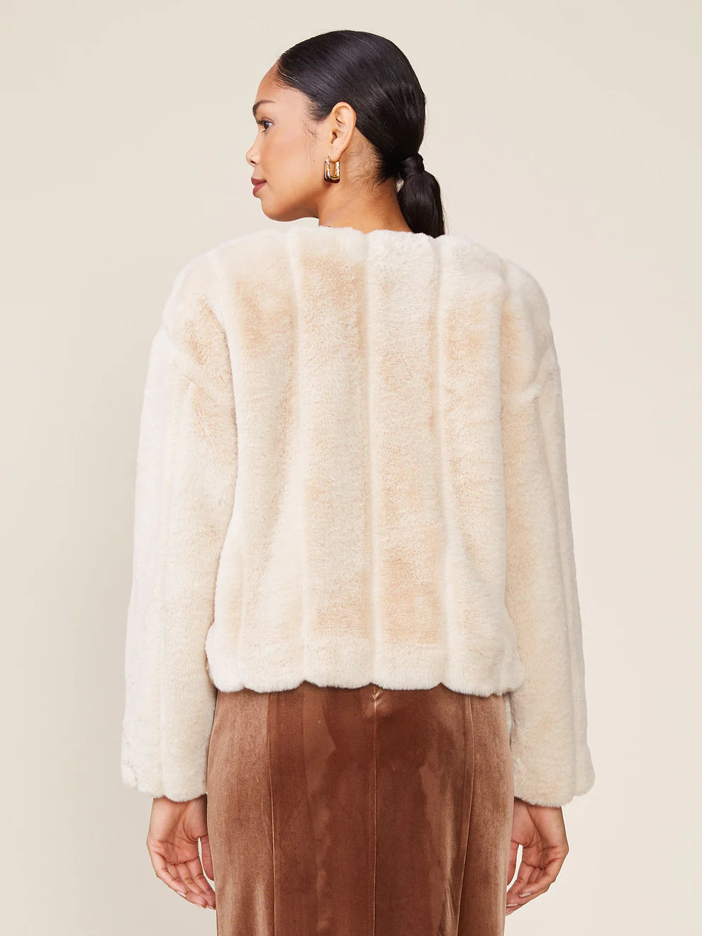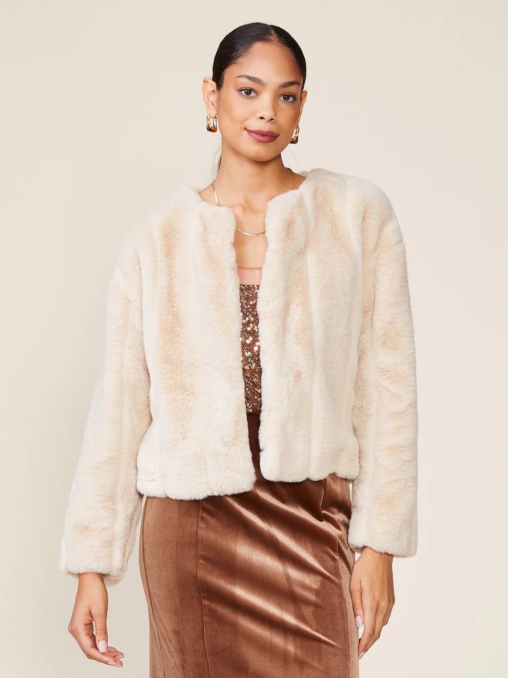 Wrap yourself up in cozy glamour this season with our luxe Faux Fur Jacket, which is the perfect statement piece for holiday celebrations. Pair this soft, plush, and effortlessly chic faux fur jacket over any dress or two-piece outfit for an elegant and sleek evening look.