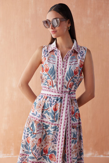 The Omika Emeline Maxi is a versatile and stylish dress, designed with a sleeveless and collared top. The buttondown closure and tie belt accent add a touch of sophistication. Made with high-quality materials, this dress offers both comfort and style for any occasion.