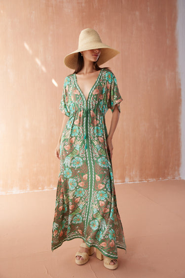 Experience effortless style with the Omika Pia Caftan. Made with a maxi length, deep v-neck, and short sleeves, this caftan offers a comfortable and chic look. Perfect for a day at the beach or a night out, the Omika Pia Caftan is versatile and flattering for any occasion.
